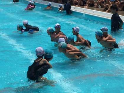さすがは最高学年の6年生、プールに入ると1年生が怖がらないように、しっかりと手を差し伸べていました。