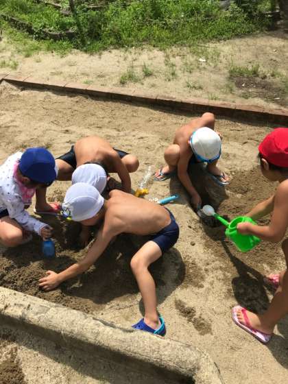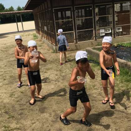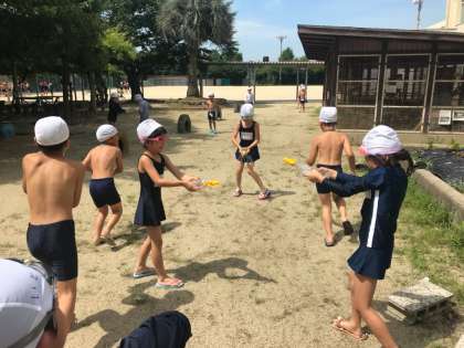 生活科の学習で、なつのあそびをしました。水をかけあったり、砂場でどろんこ遊びをしたり おおはしゃぎ。