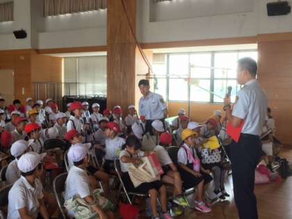 初めに学年揃って防火についてのアニメを鑑賞し、その後消防署の方に疑問に思っていることや聞いてみたいことなどを質問しました。