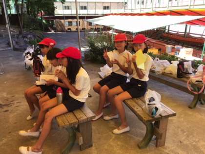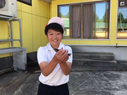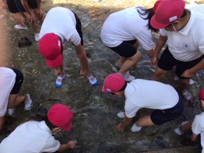 魚つかみ、焼き板の活動です。宿の方からの説明をまず、聞きます。その後、活動開始。魚つかみは、なかなかコツがいります。すぐに捕まえる子もいれば、時間のかかる子もいます。でも、頑張って全員が捕まえて写真を撮ってもらいました。捕った魚はすぐに焼いて食べます。「美味しい!」と声をあげて食べている子も多くいました。