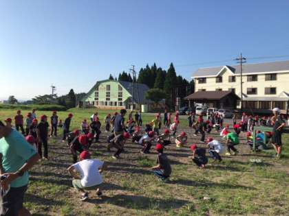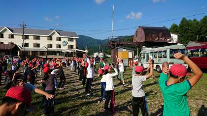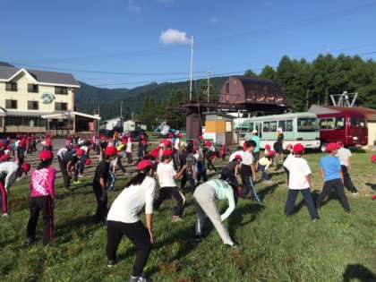 昨日と同じく、保健係が自分たちで考えた体操をし、体をほぐしました。今日は最終日、安全で楽しく過ごせるように願ってます。