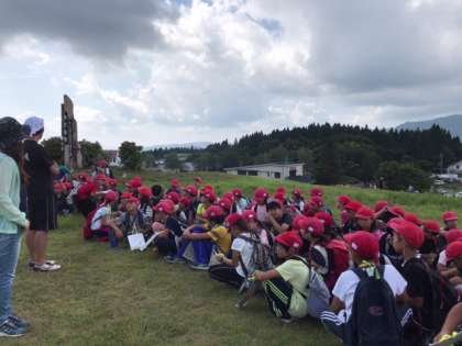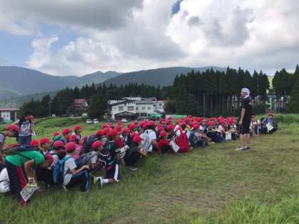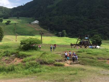 この3つをクリアーしてゴールに辿り着けば、おやつのジュースがもらえます。コースは、高丸山の中腹まで登ります。写真は登り始めたところです。少し雲が出て涼しい時もあります。みんな頑張ろう!