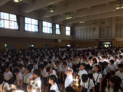 講堂内は残暑に加え、子どもたちの熱気で講堂の中はサウナのようです。式が始まる前に、体調面で無理をしないようにアドバイスをして始業式の開始です。