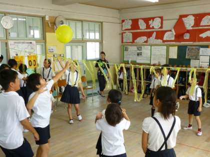 3.【5年3組】「落とせ!風船」:風船バレーボール。担当者と勝負です。