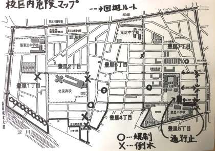 下校時は危険個所(下記のマップ参照)を避けますが、細かい危険個所がその他にもあります。都合のつく範囲で結構ですので、ご家庭でも子どもたちの見守りをお願いいたします。