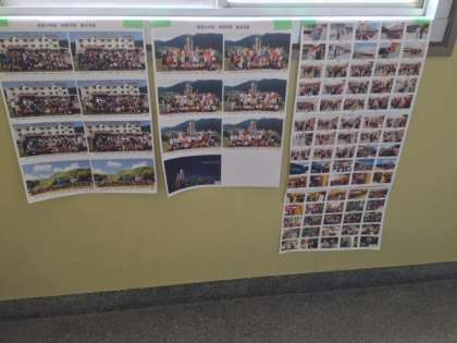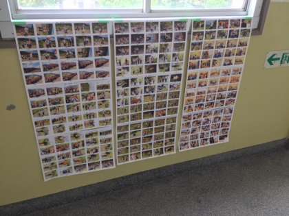 5年生の廊下に写真屋さんが撮影した「林間学習」の見本写真がたくさん貼られています。