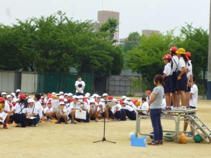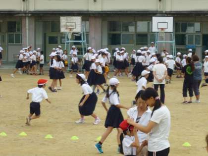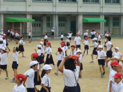 先ずは、集会委員だけが鬼で《赤帽子》。他のみんなは《白帽子》からのスタートです。鬼にタッチされると、帽子の色が赤に変わり鬼になります。