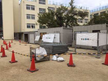 今日はまず、渡り廊下横の運動場に工事事務所の設営。