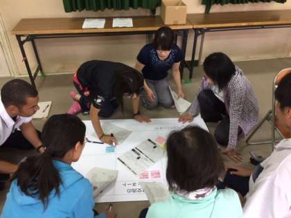 研究討議会では、小グループで授業についてのメモや質問事項を討議しながら集約して大きな紙にまとめ、全体の前で発表します。