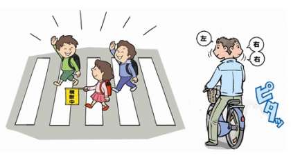 看護当番として横断歩道の見守りをしていて気になったことがありました。自動車は最も気をつけて見なければなりませんが、一番危険な状態に「ドキッ!」とするのが自転車での通行です。