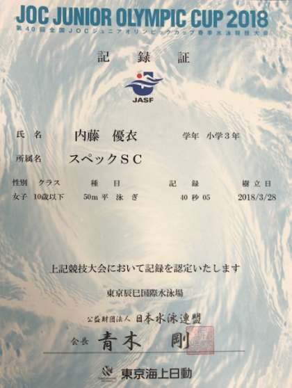 に出場し、50m平泳ぎ 40秒05の記録を認定されました。大切な記録証をお預かりし、掲載させていただきました。また、昨年のものですが、泳いでるカッコいい写真も一緒にあげています。