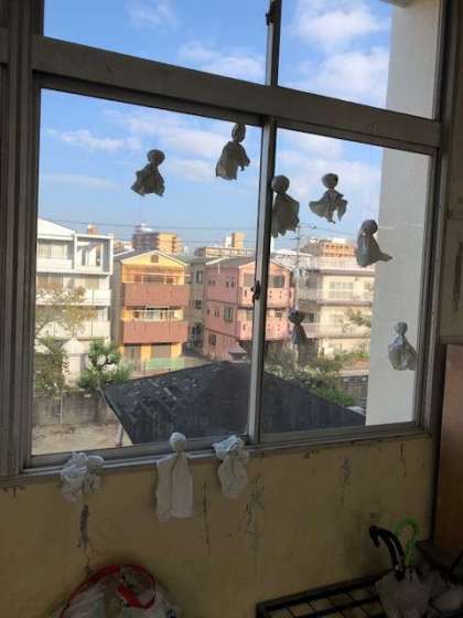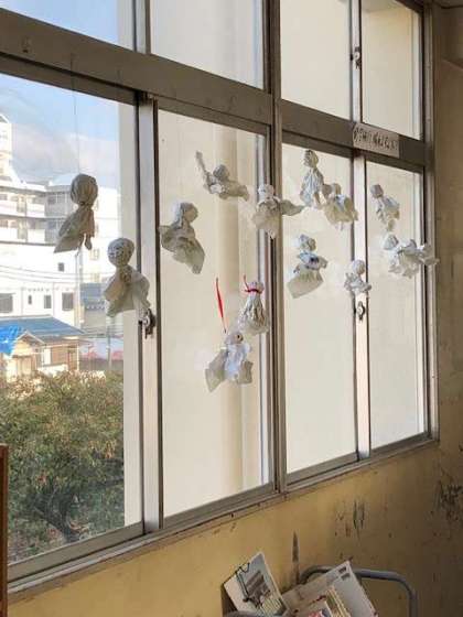 6年生の教室の前は、数十体のてるてる坊主が、明日・明後日の天気を見守っています。