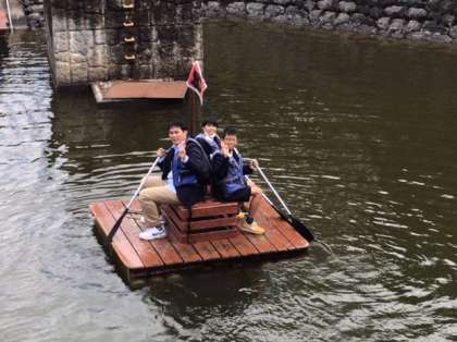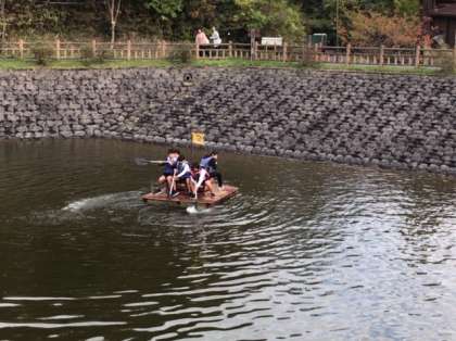 いかだ遊びが人気です。みんながバラバラに漕いじゃうとぐるぐる回って、どうしたらいいの、状態。乗ってる先生、結構、たいへん。