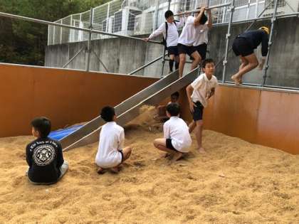 籾殻を敷きつめたところで遊ぶ籾殻遊び、籾殻だらけになってしまいましたが、楽しかったようです。(校長)