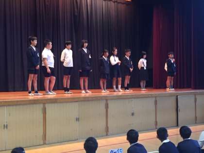 今日の児童集会は、後期の学級代表と運営委員会の発表(自己紹介)がありました。