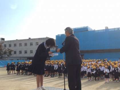 校長先生と元気に朝のあいさつをした後、鳥取県のけん玉大会の2部門で、見事優勝と準優勝の栄冠に輝いた5年生の久部 咲菜絵さんに、賞状の伝達と披露がありました。