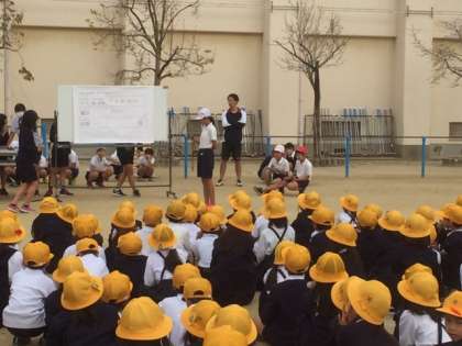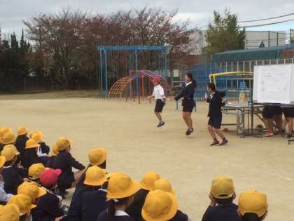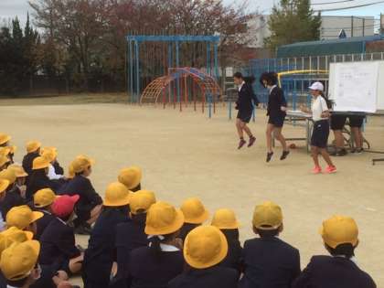 今日は運動場での児童集会、「運動委員」の発表です。