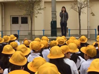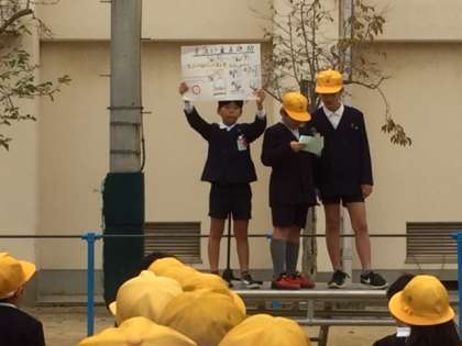 朝会では、健康委員会の手洗い週間のお知らせと、朝会当番の先生の今月の生活目標のふりかえりがありました。