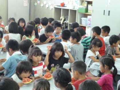 先日、アップした「園芸委員」が丹精込めて育ててくれたスイカも、しっかり熟し、収穫の時期を迎えました。
