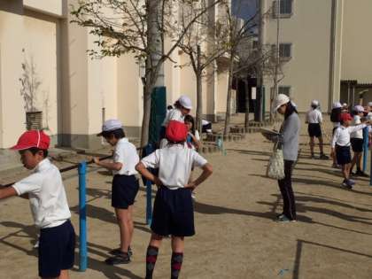 2学期もまとめの時期ということで、1組は縄跳びで、3組は鉄棒でがんばった成果を担任の先生に評価してもらっていました。