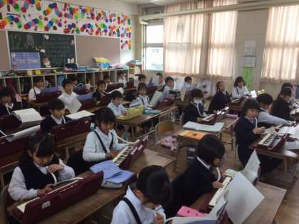 (1枚目)1年1組 音楽…アナ雪の「Let it go」の合奏です。早く日本