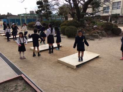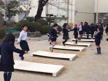 休み時間になると、豊里小学校自慢の8台の「ジャンプ台」は子どもたちでいっぱい…台数が増えたことで待ち時間も短くなり、縄跳びを楽しめる時間が増えました。