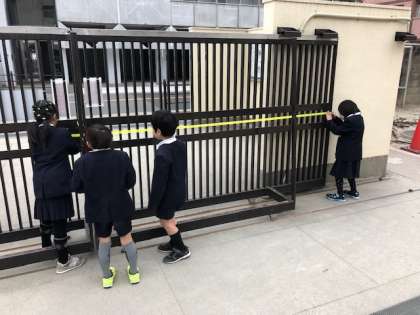 子どもたちが工夫して測ったものの中で最長は、通用門の横の長さ「7m70cm」でした。