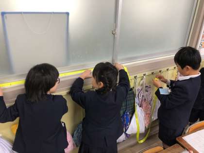 算数科の学習「長さをはかろう」で3mの長さのテープものさしを作り、測りたいものの長さを予想し、実際に測る活動を行いました。