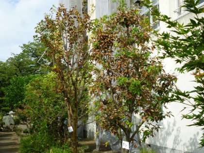 先週末から、旧正門側の樹木数本が、葉を茶色くし枯れかけています。
