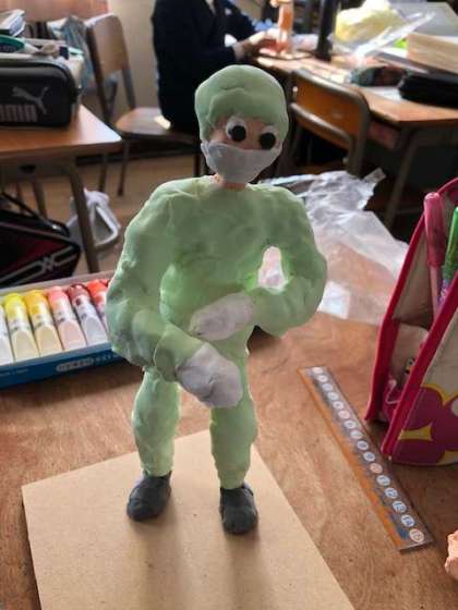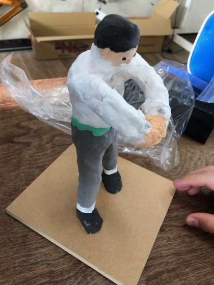 そして、粘土に絵の具を混ぜて、肌をつけていき、裸の状態を作った後に、粘土の服を着せていきます。