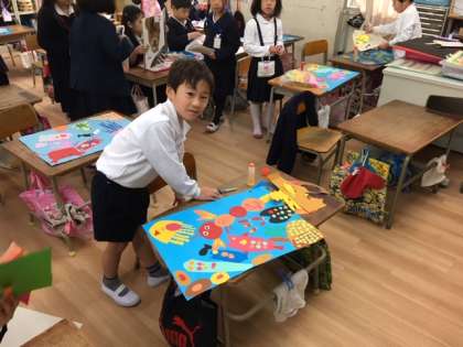 カラフルな作品が完成!切ったりちぎったりした紙を組み合わせる活動は、紙版画の学習でも応用できます。 (教務)