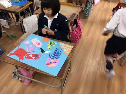 色画用紙を切ったりちぎったりして台紙にはり、海の中の様子を表現していました。