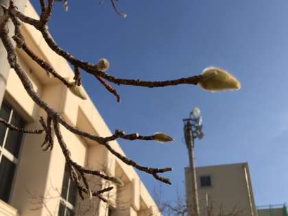 講堂前のモクレンのつぼみ、あと少しですね。
