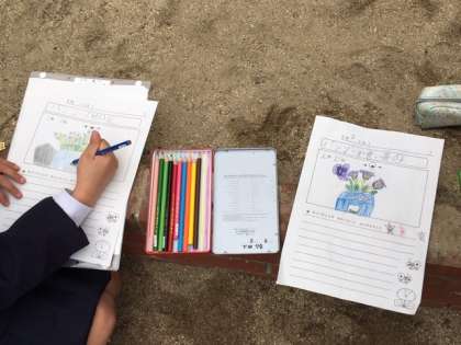 中庭のテーブルを使って観察するなんて、いいところに目をつけていますね。 (教務)