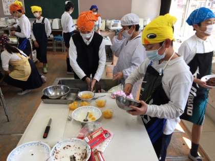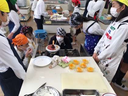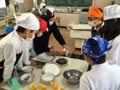家庭科室で6年2組が「ガトーショコラをつくろう」の調理実習中でした。