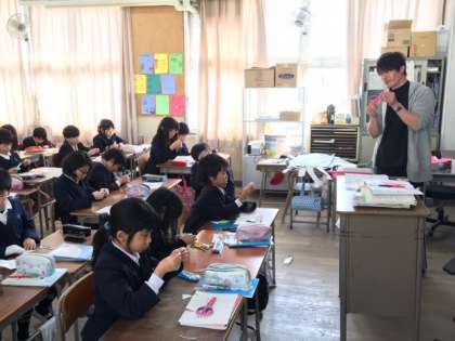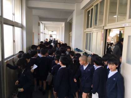多目的室から2年生が登場です。来週の「卒業を祝う会」の練習だったようです。 (教務)