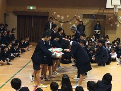 在校生から卒業生への記念品(たてわり班でお世話になった6年生への寄せ書き)と、卒業生から在校生への記念品(手作りの雑巾)の授与がありました。
