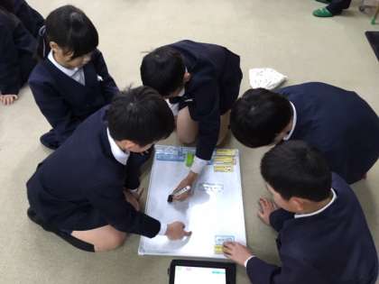 そのあと、グループごとにペッパー君を動かすプログラムを話し合って決め、ホワイトボードに書きこんでいきます。 (教務)