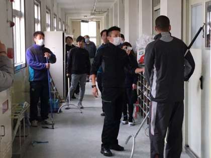 職員の声かけにも耳を貸さない不審者、近くの教室の職員が職員室に緊急通報を行うと共に、教室の施錠をし子ども達を守ります。