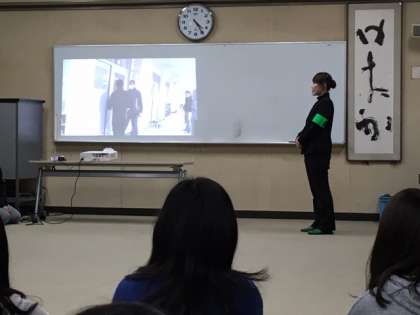 不審者確保の後は、多目的室で録画した映像を見ながら振り返りの研修です。