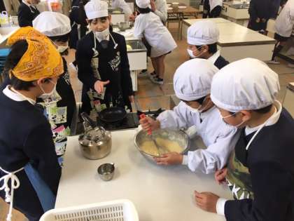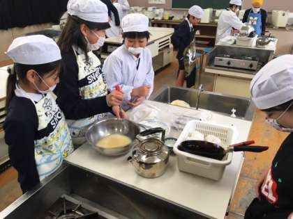 5年生は家庭科の「家族とほっとタイム」の学習で調理実習をしています。