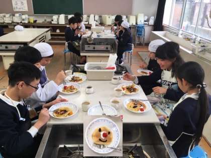 今日の調理実習は5年3組 ホットケーキを焼きながら家庭科室に楽しそうな声があふれていました