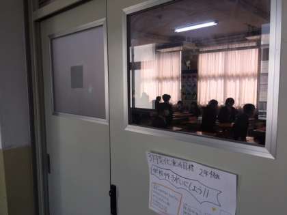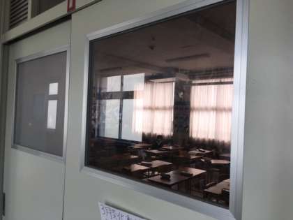 ●不審者の侵入を知らせる放送があれば、すぐに教室の電気を消し、壁際の机の下に身を隠します。(見えにくいですが2年生4組の子ども達が窓際に固まって隠れています)