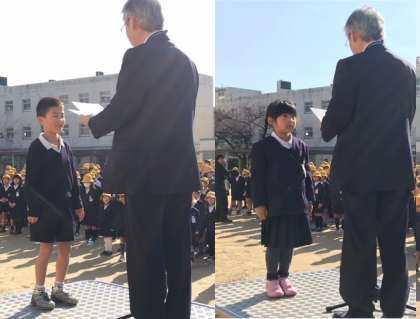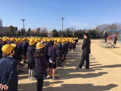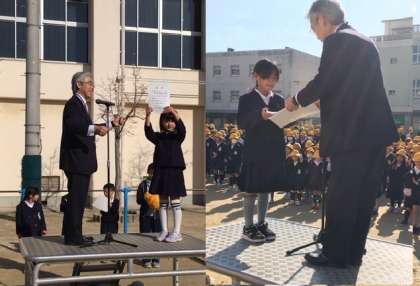 次に校長先生から「今の学年での残り少ない時間をしっかりと締めくくって、進級・進学してください。」というお話があり、朝ってに巣立つ6年生は背筋をビシッとのばして話を聞いていました。