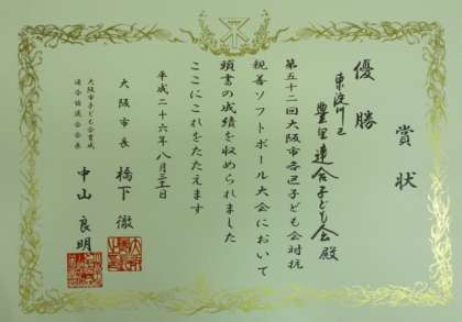 「第52回大阪市各区子ども会対抗親善ソフトボール大会」が開催され、並み居る強敵を打ち破り、見事『優勝』、3連覇を飾り、