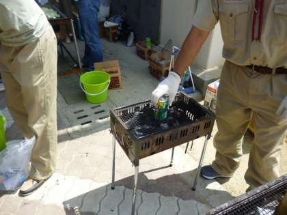 空き缶に0,5合のお米をいれてコンロの上で火にかけます。