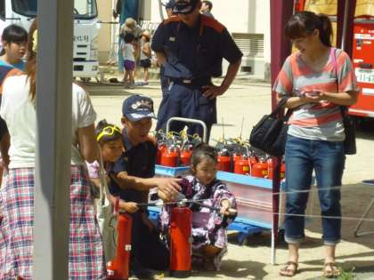 初めて触る消火器に子ども達は興味津々、その扱い方を学んでいました。