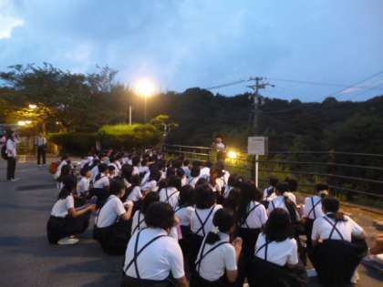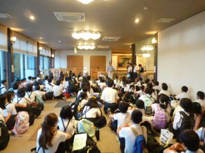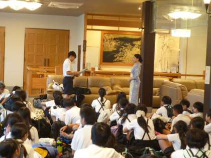 ホテルみち潮に到着して、開舎式や避難訓練をしている様子です。