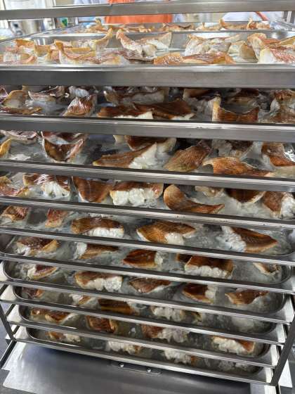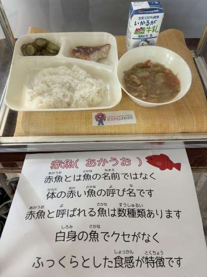 「あかうお」は、魚の名前では、なく、皮の色が赤い魚のことです。代表的な「あかうお」は、あこうだいやアラスカメヌケなどです。今日は、あかうおを蒸し焼きにみりん、うすくちしょうゆ、湯を煮立てたタレをかけて作りました。身が柔らかくておいしいと好評でした。
