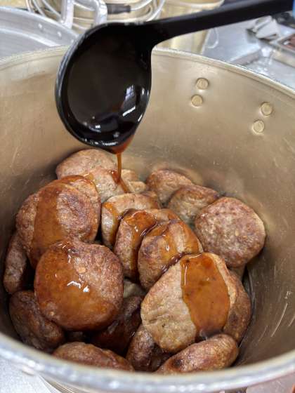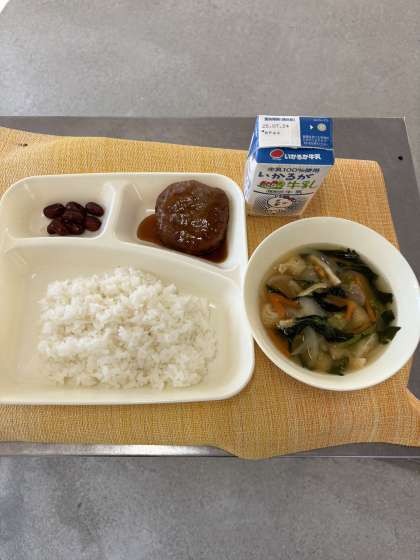 今日は、和風ハンバーグでした。ハンバーグを蒸し焼きにして砂糖、みりん、こいくちしょうゆ、湯を合わせて煮たてた水どきでんぷんでとろみをつけたタレをかけていただきました。大好評でした。